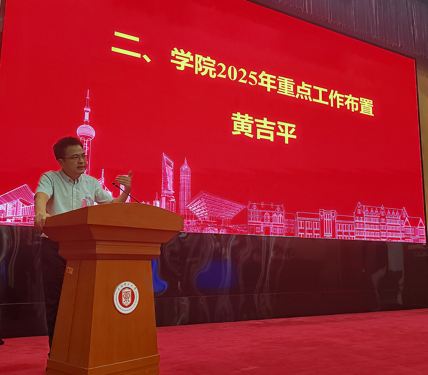随后,院长黄吉平对学院2025 年的重点工作进行了全面部署。他指出,学院发展将实现从量变到质变的跨越,从以教学为主向教学科研并重转变,明确核心战略目标为建设教学科研并重的研究性学院。为达成这一目标,学院将分解任务,确立三个战术目标:学位点建设、人才梯队建设和研究成果实现突破。为保障以上目标的顺利实施,黄吉平院长提出了具体措施:一是自2025 年起,全面启动博士点申报工作,成立专班,邀请骨干教师共同参与,全力推进申报进程;二是精准化引进三类人才,开展有组织的科研,组建两个学科科研团队,充分激活科研潜力;三是深化绩效改革,强化公共服务,以激发教职工的工作积极性和创造力。