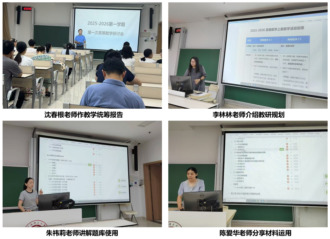 随后,沈春根老师就本学期课程安排作了总体介绍,从教学进度、质量把控、资源分配及教师协作机制等方面为后续工作指明了方向。在具体教研环节中,李林林老师介绍了本学期教研活动的详细安排,为教师交流经验、提升教学能力搭建平台;高等数学A1课程组长朱祎莉老师开展题库使用培训,讲解题库架构、试题检索及灵活组卷方法,助力教师精准利用资源;高等数学C1课程组长陈爱华老师则分享教学资源运用经验,建议结合教学内容与学情,整合教材、课件等材料以提升教学效率。