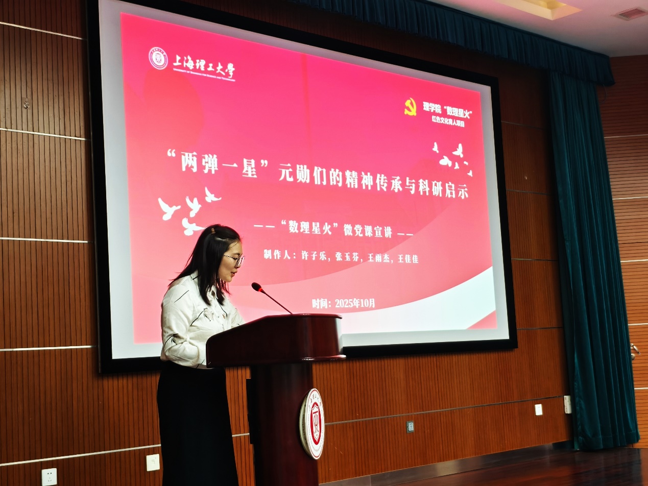 活动在庄严的国歌声中拉开序幕,全体党员肃立齐唱,饱含对祖国的热爱与敬意。随后,围绕“‘两弹一星’元勋们的精神传承与科研启示”主题展开学习交流,研究生基础数学党支部罗市娟结合自身数理专业学习经历,她提到,“两弹一星”元勋们在艰苦条件下坚守科研初心、攻克技术难关的精神,对青年学子极具启示意义,作为理科学子,既要学习元勋们秉持严谨求实的科研态度,在公式推导、数据计算中精益求精;更要牢记科技报国的使命,把专业所学与国家需求紧密结合,让数理知识成为服务祖国发展的“硬核力量”。她的分享引发在场党员强烈共鸣,进一步深化了大家对科研报国的理解。